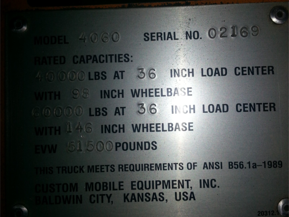 • Capacity: 60,000lbs [tag reads 30,000lbs, re-manufactured in 2010 for 60,000lbs]