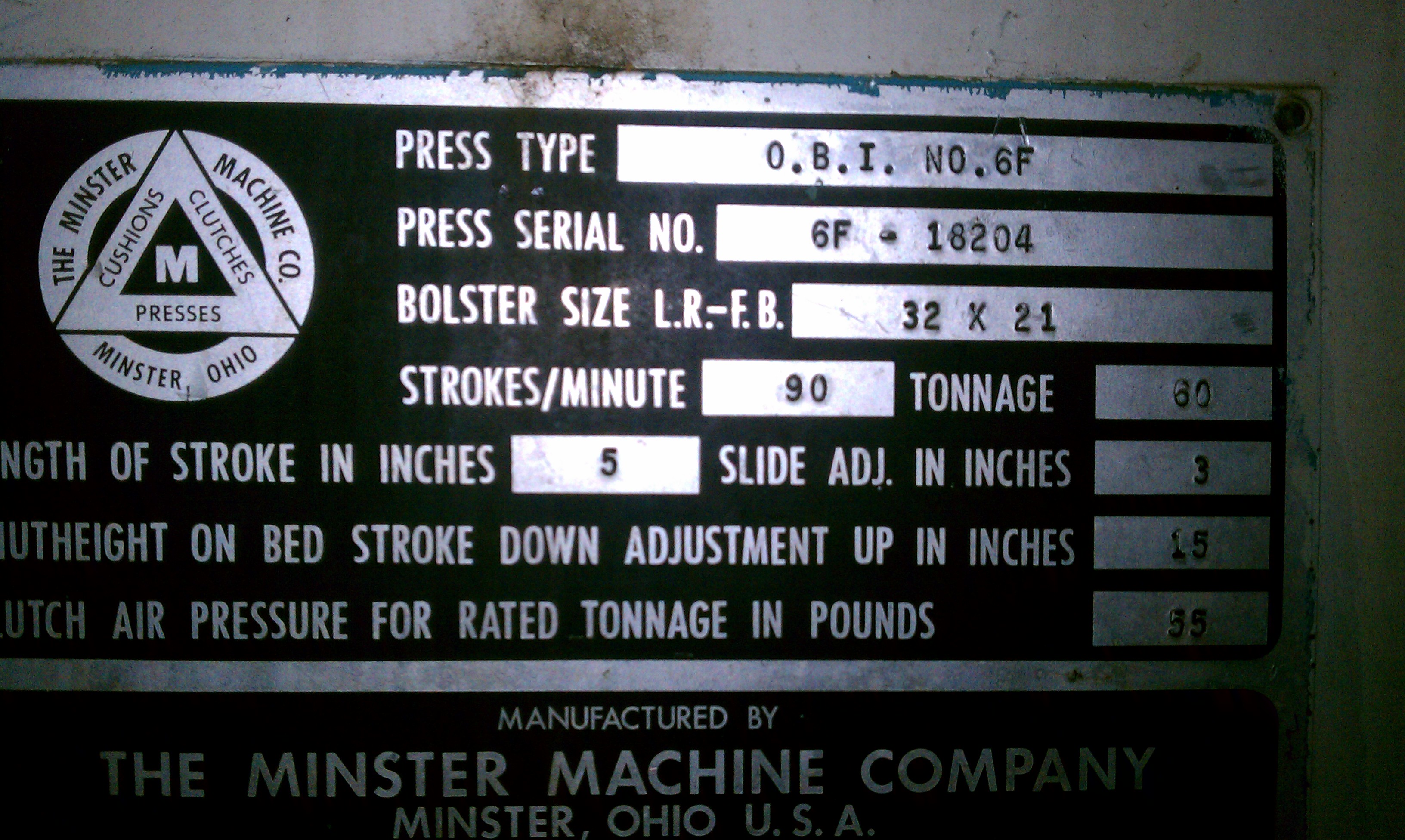 60 Ton Minster OBI Press For Sale Posted on by Dev 60 Ton Minster OBI Press For Sale Minster Fly Wheel Type OBI Press Serial Number 6F-18204 Model 6F Year 1968 Capacity 60 Tons Bed Area 32″ x 21″ Slide Area 21″ x 14″ Stroke 5″ Slide Adjustment 3″ Shut Height 15″ Speed 90 SPM Missing Bolster Plate Share Post Tweet Share this:Click to share on Twitter (Opens in new window)Click to share on Facebook (Opens in new window)Click to share on Google+ (Opens in new window) Related
