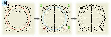 You can add automated centerlines and center marks to circles, arcs, ellipses, and patterns, including models with holes and extruded cuts (except mid-plane extrusions). iFeatures and iParts can also have automated centerlines and center marks.