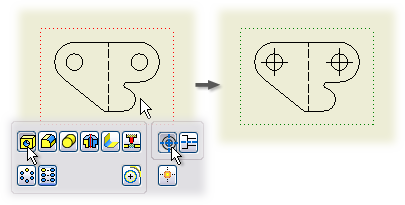 You can add automated centerlines and center marks to circles, arcs, ellipses, and patterns, including models with holes and extruded cuts (except mid-plane extrusions). iFeatures and iParts can also have automated centerlines and center marks.