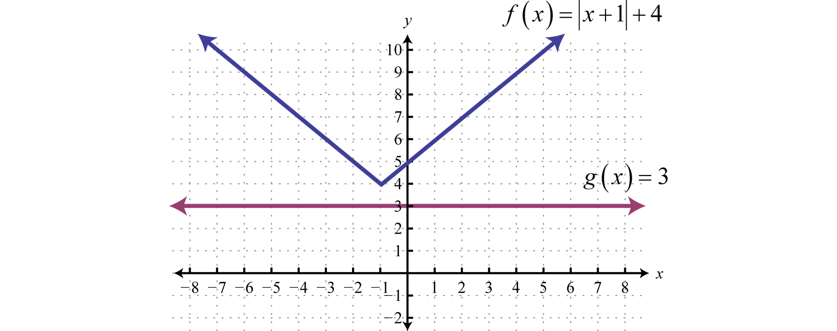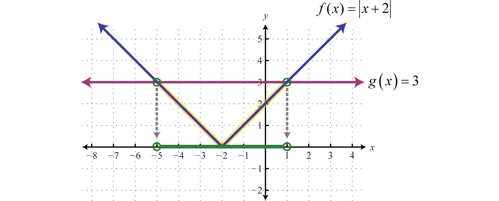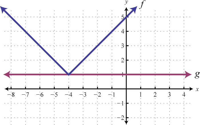 To visualize these solutions, graph the functions on either side of the equal sign on the same set of coordinate axes. In this case, is an absolute value function shifted two units horizontally to the left, and is a constant function whose graph is a horizontal line. Determine the x-values where