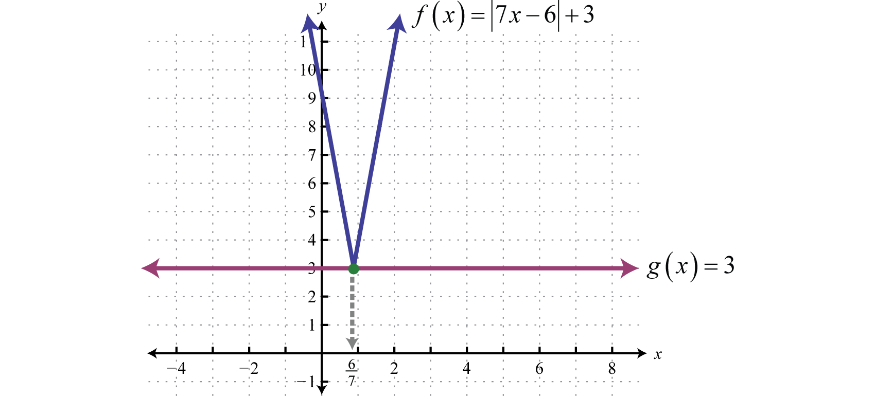 In this case, we can see that the isolated absolute value is equal to a negative number. Recall that the absolute value will always be positive. Therefore, we conclude that there is no solution. Geometrically, there is no point of intersection.