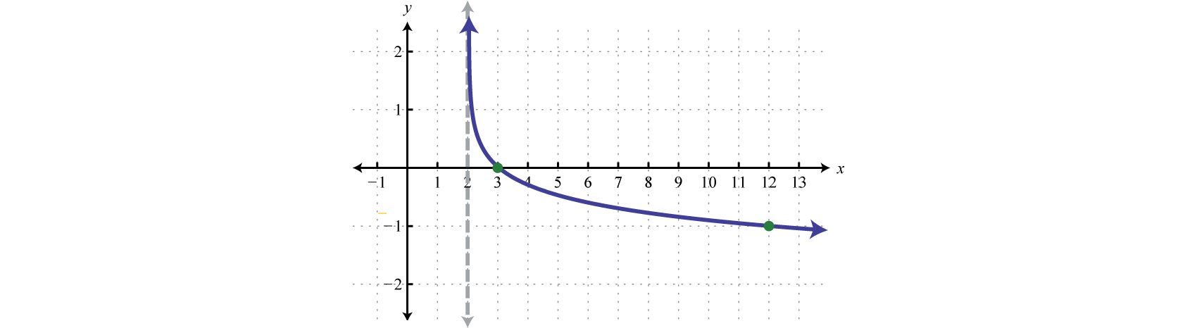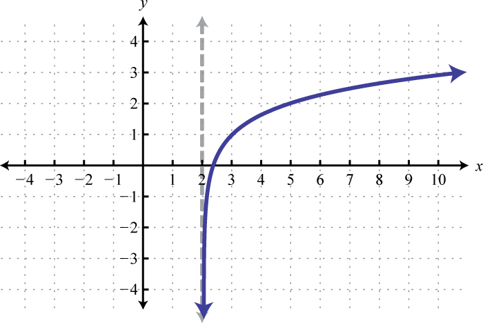 Here the vertical asymptote was shifted two units to the right. This defines the lower bound of the domain.