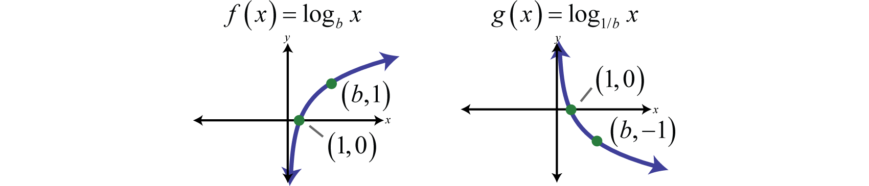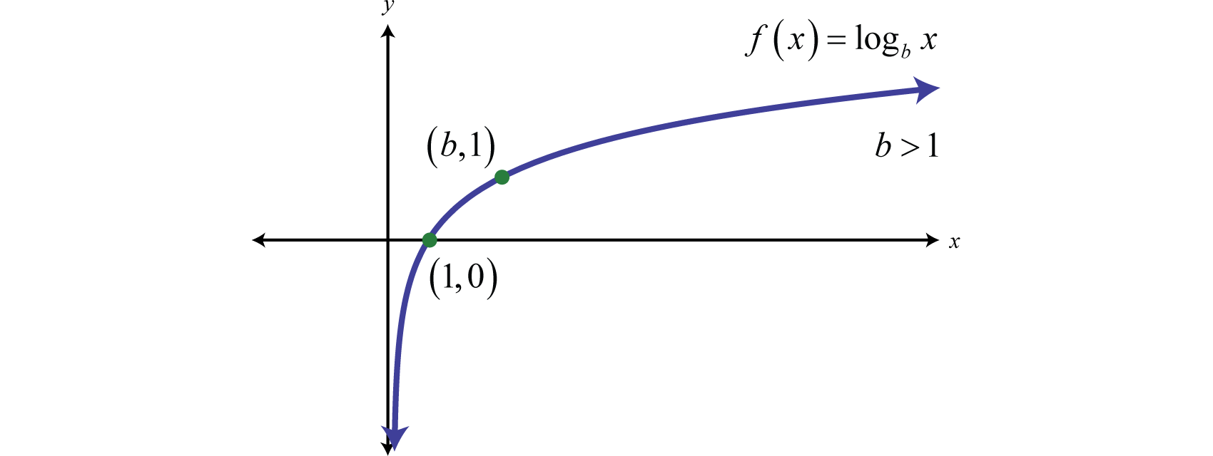 The domain consists of positive real numbers, and the range consists of all real numbers, The y-axis, or , is a vertical asymptote and the x-intercept is In addition, and so is a point on the graph no matter what the base is.