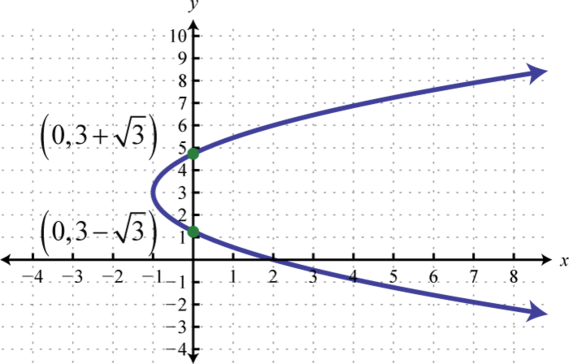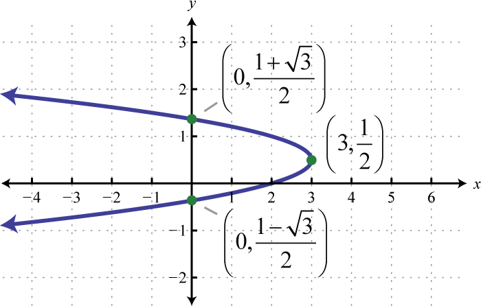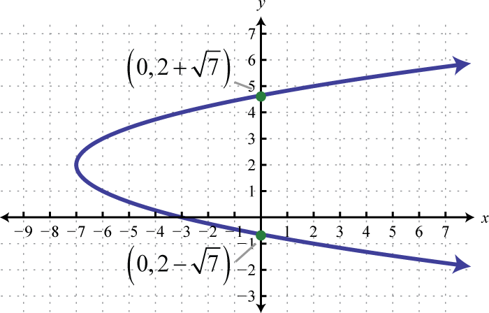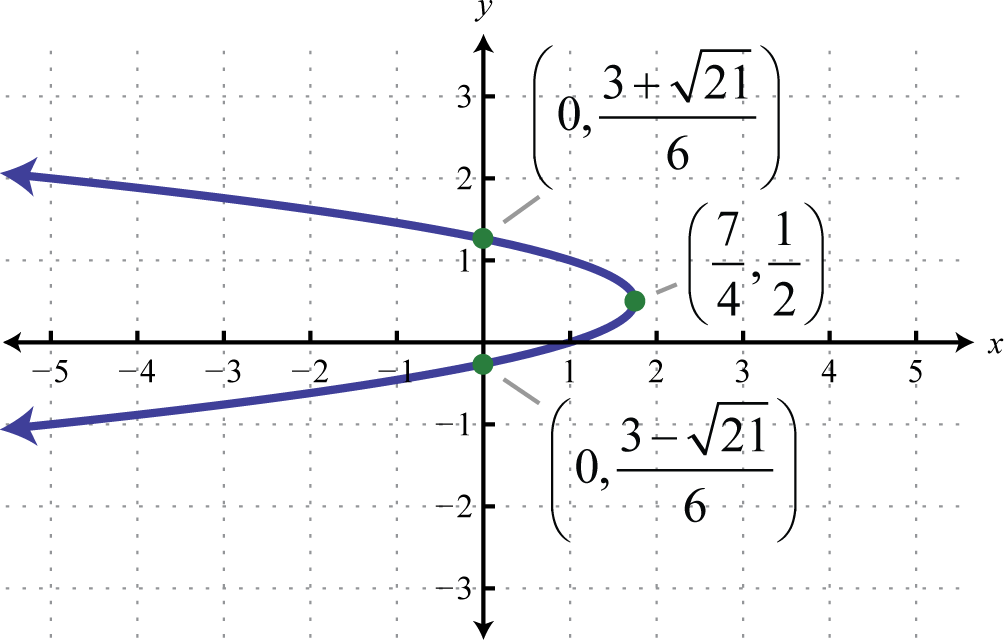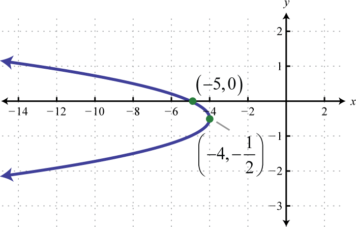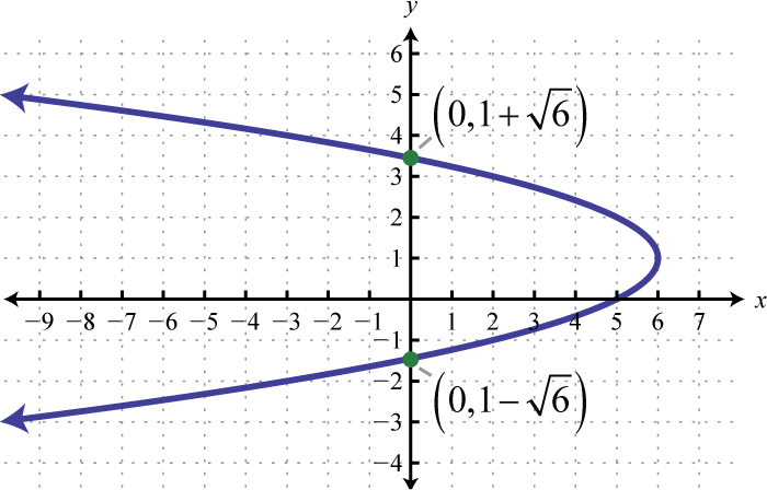 Therefore, from vertex form, , we can see that the vertex is Because the vertex is at and the parabola opens to the left, we can conclude that there are no y-intercepts. Since we only have two points, choose some y-values and find the corresponding x-values.