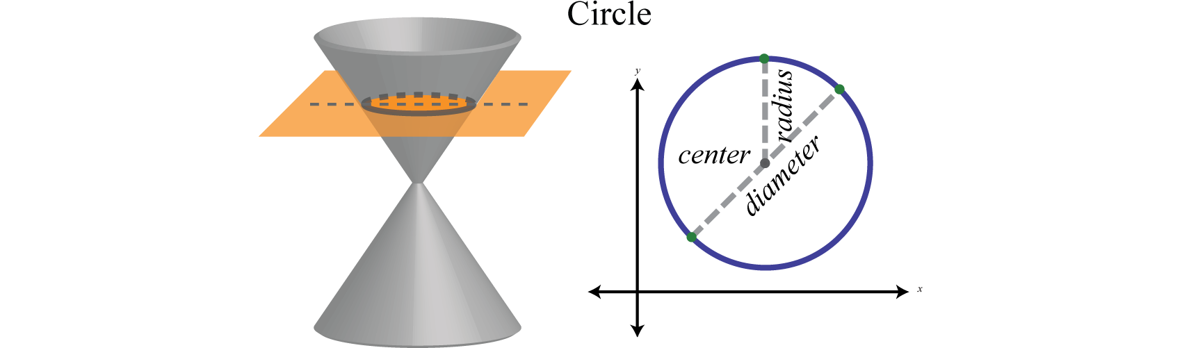 A circleA circle is the set of points in a plane that lie a fixed distance from a given point, called the center. is the set of points in a plane that lie a fixed distance, called the radiusThe fixed distance from the center of a circle to any point on the circle., from any point, called the center. The diameterThe length of a line segment passing through the center of a circle whose endpoints are on the circle. is the length of a line segment passing through the center whose endpoints are on the circle. In addition, a circle can be formed by the intersection of a cone and a plane that is perpendicular to the axis of the cone: