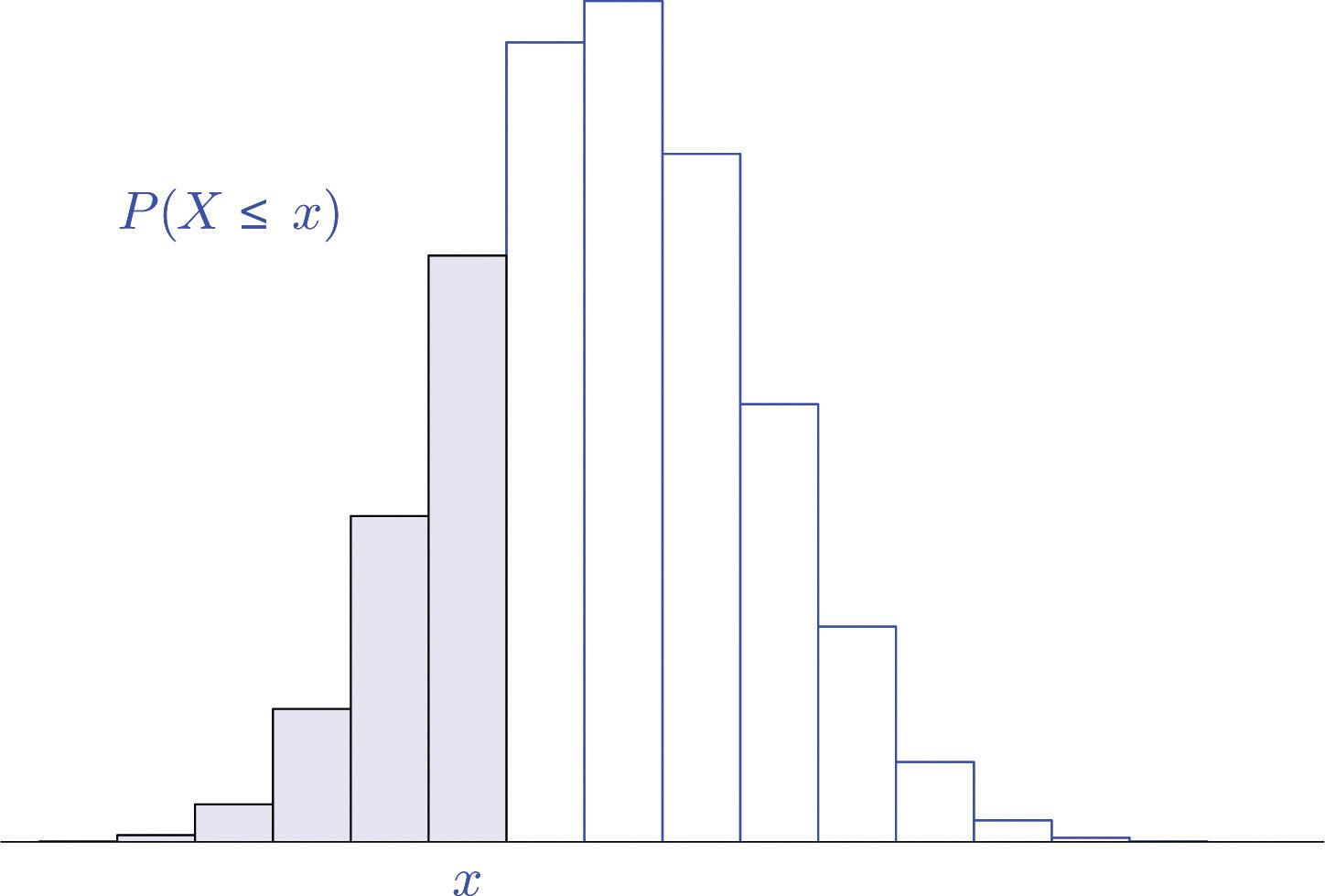 This is illustrated in Figure 4.6 "Cumulative Probabilities". The probability entered in the table corresponds to the area of the shaded region. The reason for providing a cumulative table is that in practical problems that involve a binomial random variable typically the probability that is sought is of the form or The cumulative table is much easier to use for computing since all the individual probabilities have already been computed and added. The one table suffices for both or and can be used to readily obtain probabilities of the form , too, because of the following formulas. The first is just the Probability Rule for Complements.