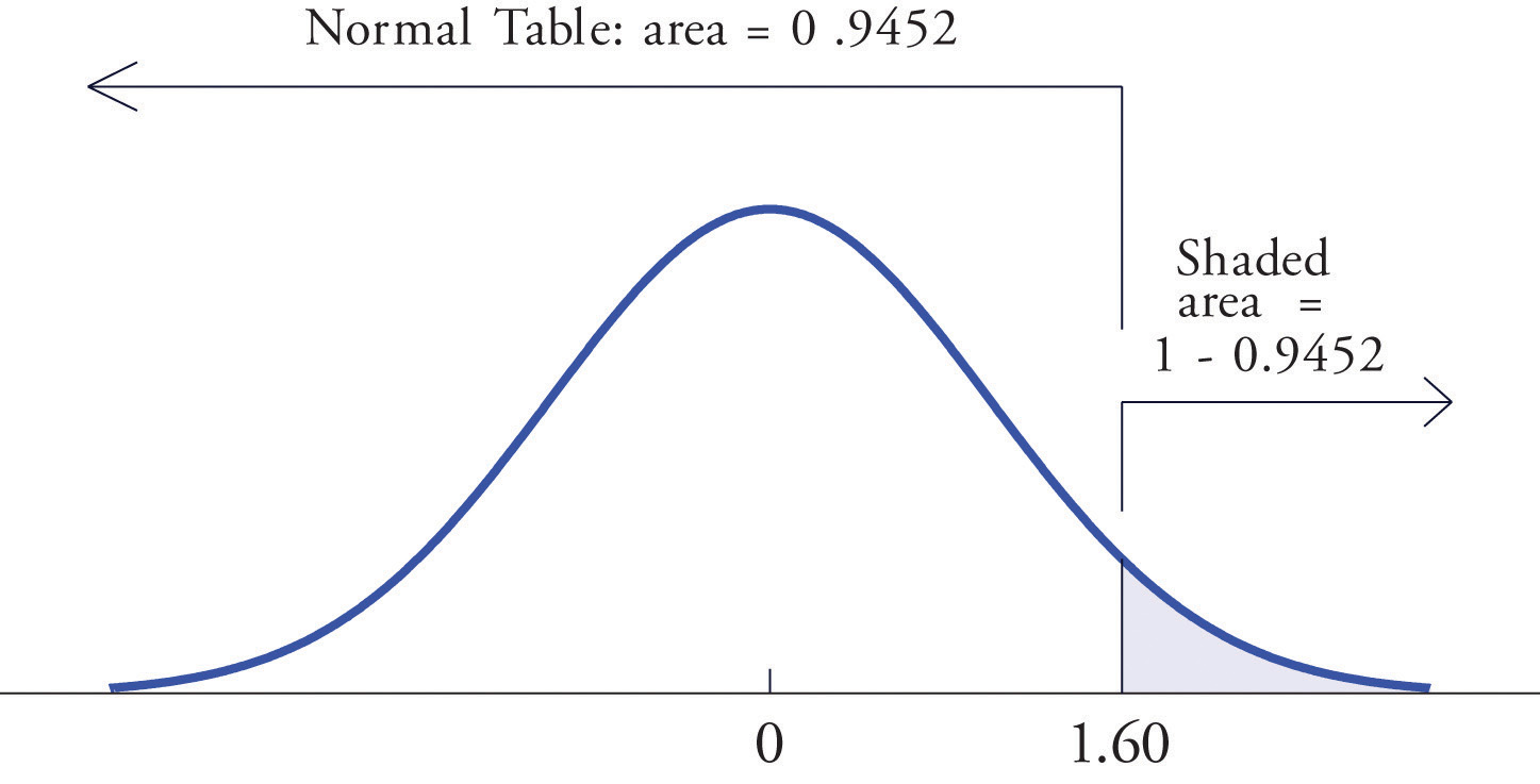 Figure 5.11 "Computing a Probability for a Right Half-Line" illustrates the ideas geometrically. Since the total area under the curve is 1 and the area of the region to the left of 1.60 is (from the table) 0.9452, the area of the region to the right of 1.60 must be