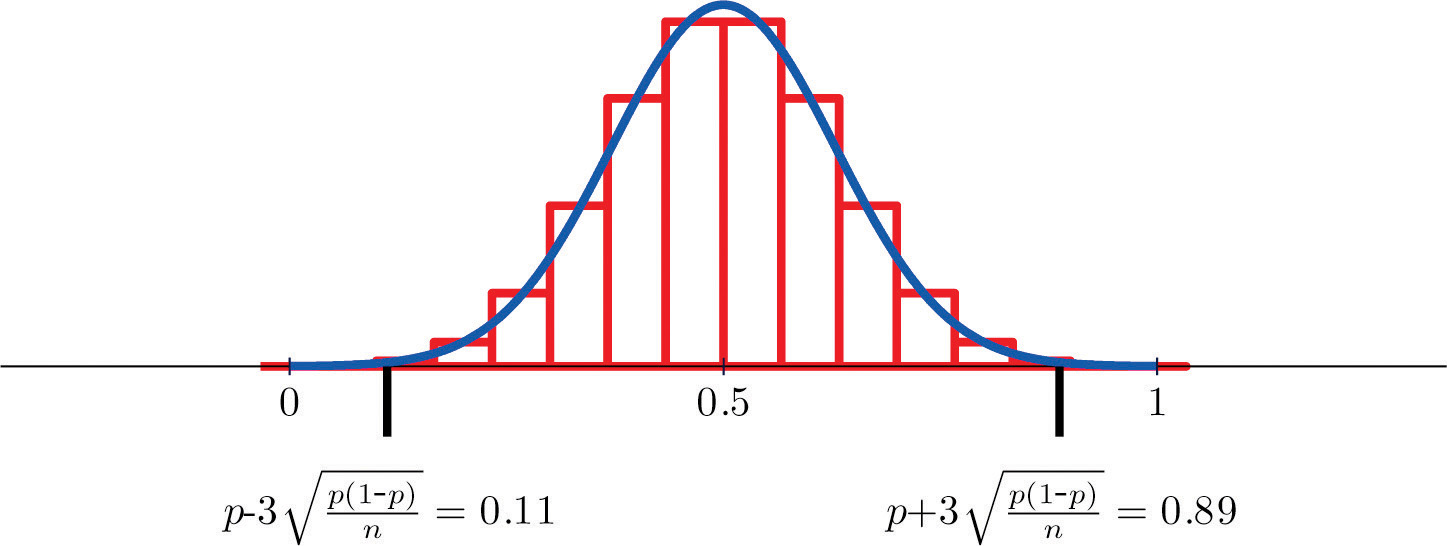 Figure 6.5 "Distribution of Sample Proportions" shows that when p = 0.1 a sample of size 15 is too small but a sample of size 100 is acceptable. Figure 6.6 "Distribution of Sample Proportions for " shows that when p = 0.5 a sample of size 15 is acceptable.