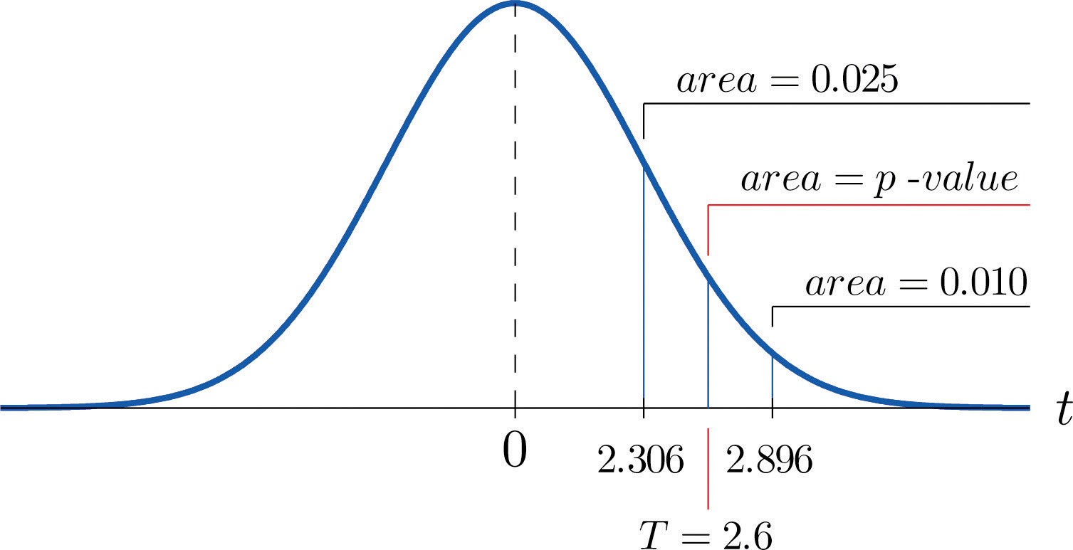 Step 4. Because the test is one-tailed the observed significance or p-value of the test is just the area of the right tail of Student’s t-distribution, with 8 degrees of freedom, that is cut off by the test statistic T = 2.600. We can only approximate this number. Looking in the row of Figure 12.3 "Critical Values of " headed , the number 2.600 is between the numbers 2.306 and 2.896, corresponding to t0.025 and t0.010.
