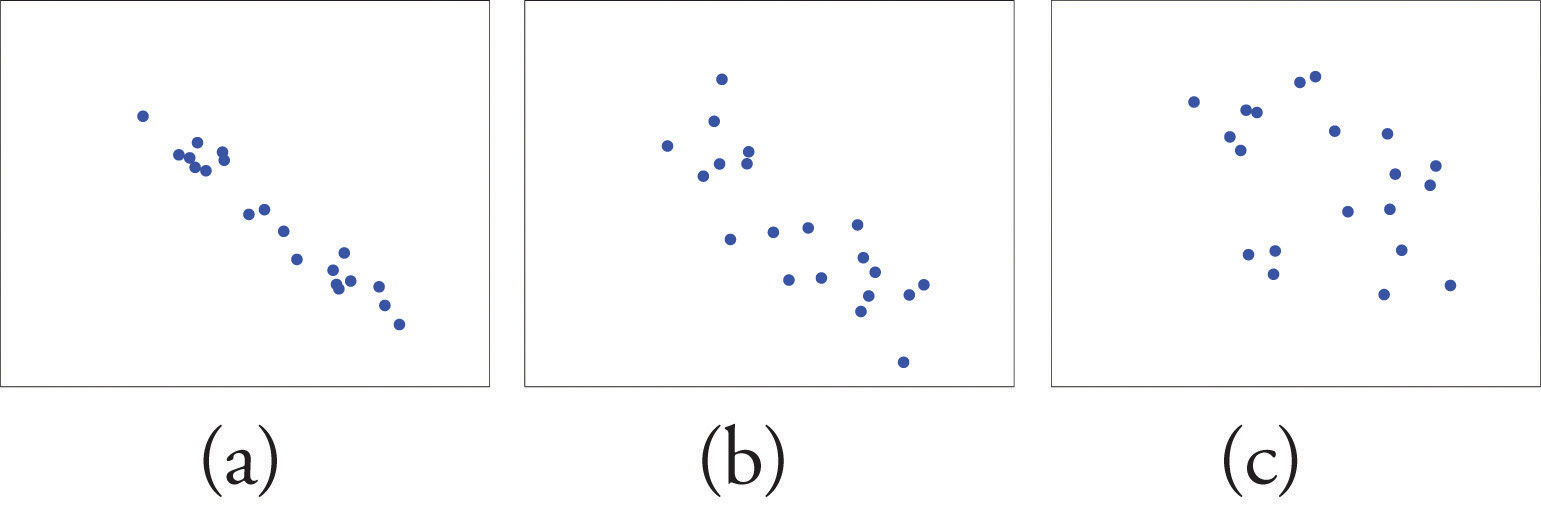 Figure 10.3 "Linear Relationships of Varying Strengths" illustrates linear relationships between two variables x and y of varying strengths. It is visually apparent that in the situation in panel (a), x could serve as a useful predictor of y, it would be less useful in the situation illustrated in panel (b), and in the situation of panel (c) the linear relationship is so weak as to be practically nonexistent. The linear correlation coefficient is a number computed directly from the data that measures the strength of the linear relationship between the two variables x and y.