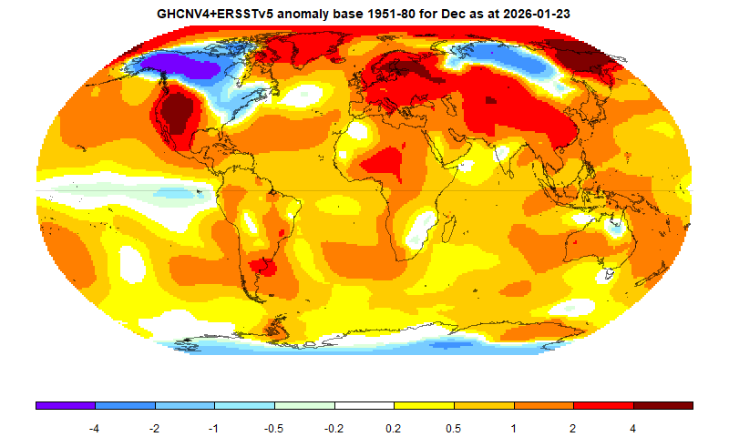 Report: global average anomaly as at 2026-01-23 based on 14033 stations for latest month, mesh weighting, anomaly base 1961-90