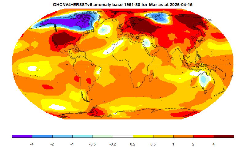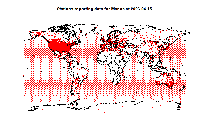 Report: global average anomaly as at 2026-04-15 based on 11270 stations for latest month, mesh weighting, anomaly base 1961-90